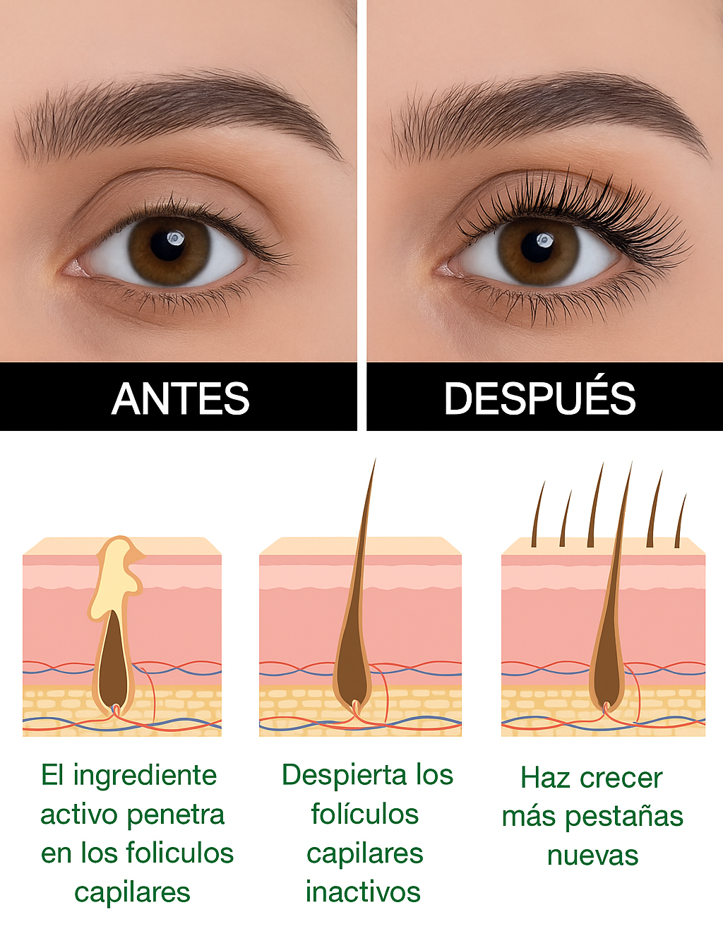 Su fórmula avanzada, elaborada con ingredientes naturales, actúa desde la raíz para estimular el crecimiento natural, fortaleciendo cada hebra y transformando tu mirada en pocas semanas.
