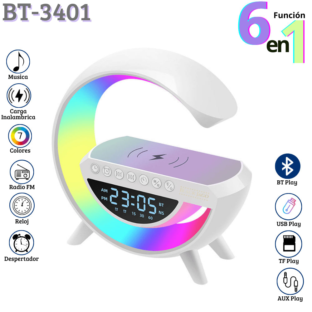 - Funcionalidades integradas: Altavoz, cargador inalámbrico, luz ambiental y reloj despertador